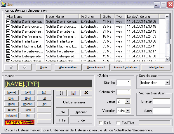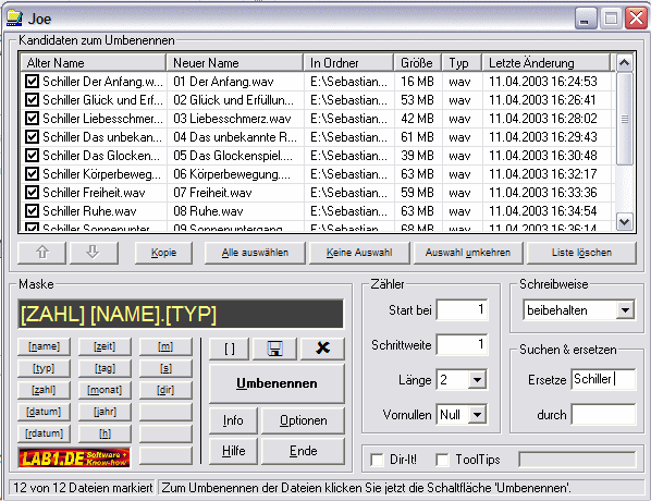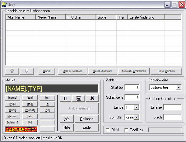 Mit einem Klick auf „Umbenennen“ wird die Aktion durchgeführt und „Joe“ ist nun wieder leer und die ausgewählten Dateien sind umbenannt. Mit dem Disketten-Button können bereits benutzte Schemata wieder aufgerufen werden. Mit Ende wird das Programm beendet.