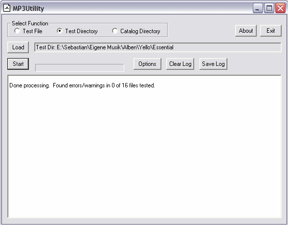 Die Bedienung ist recht einfach. Wir testen hier einmal exemplarisch ein Verzeichnis. Dazu reicht ein Klick auf „Test Directory„, was frei übersetzt „Teste Verzeichnis“ heißt. Mit einem Klick auf „Load“ (Laden) kann man das zu testende Verzeichnis auswählen. Mit einem Klick auf „Options“ kommt man in die Optionen. Hier kann man auf Wunsch bei dem Punkt „Test Dir“ mit einem Häkchen bei „Move files with errors / warning to the following directory“ ein Verzeichnis angeben, in welches defekte Dateien verschoben werden sollen. Alle anderen Optionen sollten nicht verändert werden. Mit einem Klick auf „Start“ wird die Überprüfung gestartet. Nach kurzer Zeit steht das Ergebnis fest.
