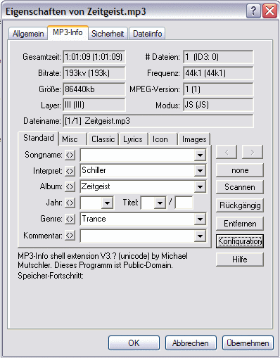Wenn man den Mauszeiger etwas länger über ein solches Icon hält, wird der ID3-Tag angezeigt. Mit einem Rechtsklick auf eine solche Datei und einem Klick auf „Eigenschaften“ sieht man nun einen neuen Reiter: „MP3-Info„. Mit einem Klick darauf sieht man ID3-Tag-Details, welche sich bequem ändern lassen.