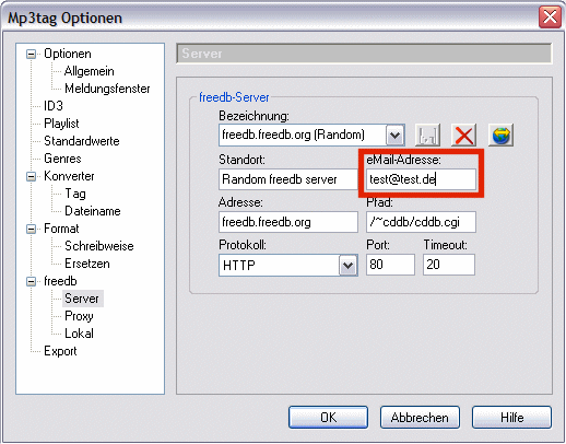 Da das Programm eine freedb.org-Unterstützung bietet, werden wir diese Funktion auch nutzen. Vorher muss aber noch die E-Mail-Adresse eingegeben werden. Dazu klicken wir auf „Extras“ und anschließend auf „Optionen„. Unter dem Punkt „freedb“ findet sich ein Punkt „Server„. Der Schriftzug „Server“ muss mit einem einfachen Klick markiert werden. Nun sieht man rechts die entsprechenden Optionen. Bei E-Mail muss wieder eine E-Mail-Adresse eingetragen werden: