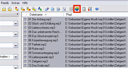 Nun müssen alle Dateien markiert werden, was sich schnell mit der Tastenkombination [STRG]+[A] erledigen lässt. Anschließend klicken wir auf den freedb-Button, welcher durch eine Weltkugel mit gelbem doppelseitigen Pfeil gekennzeichnet ist: