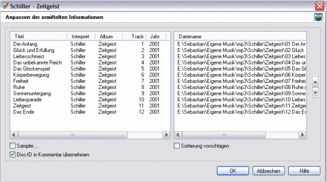 Hier sollte das Häkchen bei „Disk-ID in Kommentar übernehmen“ gesetzt werden. Da wir die Dateien schon sinnvoll durchnummeriert haben, ist eine Sortierung nicht notwendig. Ganz rechts befinden sich Pfeil-Buttons, mit denen sich auch eine manuelle Sortierung bewerkstelligen lässt. Mit einem Klick auf OK werden die Daten übernommen. Dieser Vorgang kann einen Moment dauern. Das Ergebnis sieht in unserem Beispiel nun so aus: