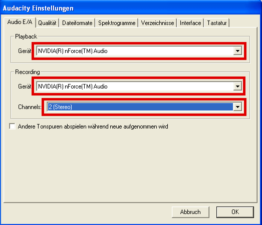 Kommen wir zuerst einmal zu den Einstellungen. Dazu klicken wir auf „Datei“ und anschließend auf „Einstellungen„. In der Kartei „Audio E/A“ wählen wir unsere Soundkarte aus. Für Aufnahmen ist die untere Markierung maßgeblich für die Qualität, wie der Screenshot zeigt: