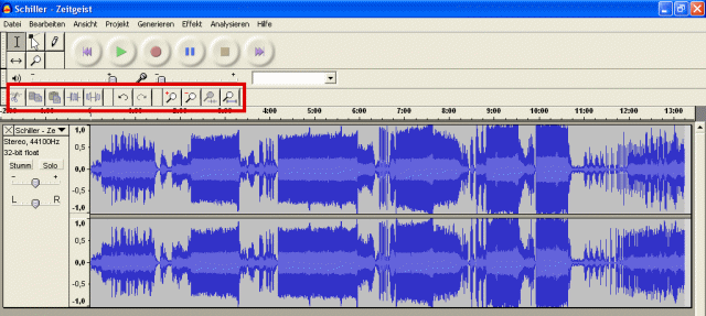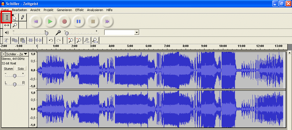 Wenn wir eine Datei zum Bearbeiten öffnen, ist es egal, ob es sich um eine MP3- oder eine WAV-Datei handelt. Allerdings macht es wenig Sinn, erst einen Titel als MP3 auszulesen, um ihn nach der Bearbeitung als WAV zu speichern und dann wieder in das mp3-Format zu komprimieren. Beim Öffnen gibt es zwei Möglichkeiten. Entweder wir gehen über „Datei“ -> „Öffnen“ oder auf „Project“ -> „Audio importieren“. Nach dem Öffnen sollte das rot markierte „Auswahlwerkzeug“ aktiviert sein.