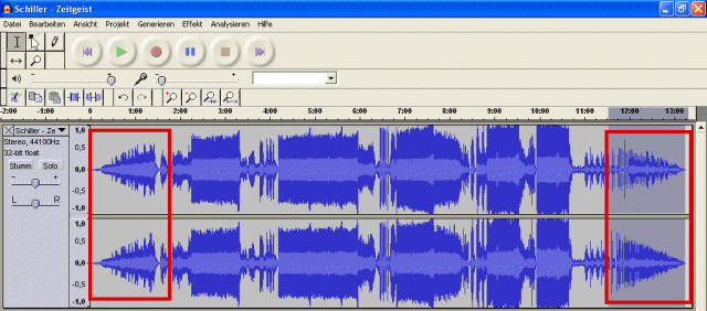 Im folgenden Bild sehen wir eine Aus- und Einblendung: Einblendung ist dann sinnvoll, wenn der Anfang langsam lauter werden soll. Bei der Ausblendung macht man dies am Ende, um die Musik ausklingen zu lassen. Hier ein Beispiel: