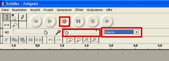 Mit diesem Programm können auch Aufnahmen von externen Quellen gemacht werden. Dazu müssen noch der Kanal (zum Beispiel Line-In) und die Aufnahmelautstärke eingestellt werden, anschließend kann man die Aufnahme starten: