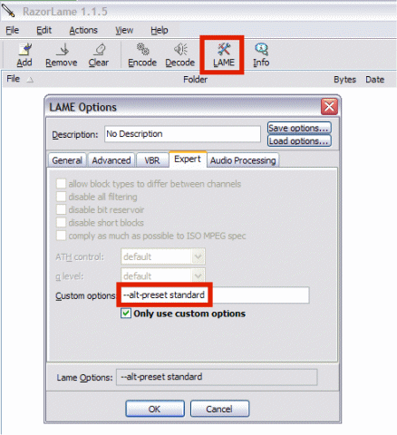 Nun müssen noch kurz Einstellungen für den Codec selbst getätigt werden, denn wir wollen das Ergebnis der Komprimierung nach unseren Wünschen gestalten. Dazu klicken wir auf den Button „Lame“ und wechseln in den Reiter „Expert„. Dort setzen wir das Häkchen bei „Only use custom options“ und tragen bei „Custom Options“ den Parameter –alt-preset standard ein: