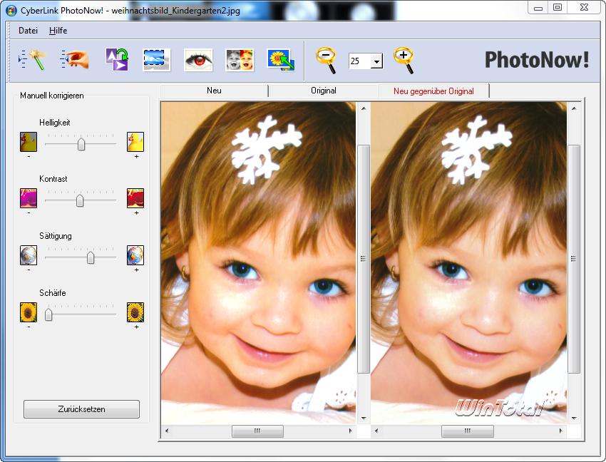 PhotoNow! ist ein sowohl im Look and Feel als auch im Funktionsumfang eher ärmlicher, nicht zu den übrigen Bestandteilen der MediaSuite passender Fotoeditor, welcher Bilder mit Effekten versehen und zuschneiden sowie Farbanpassungen und die Rote-Augen-Entfernung vornehmen kann. Immerhin gibt es eine Neu:Original-Ansicht.