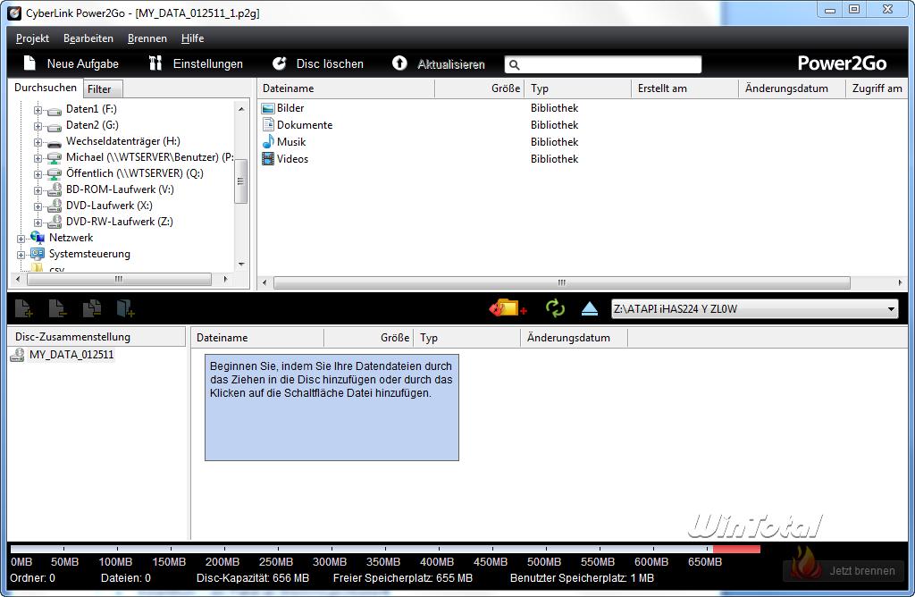 Die Darstellung beim Brennen von Dateien entspricht der üblichen in 3-teiliger Ansicht: