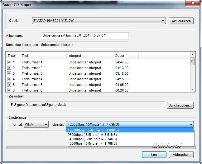 Die Audio-Ripp-Funktion, welche auch vom App Launcher zum Auslesen von Musik angesprochen wird, ist sehr spartanisch. Lediglich WAV oder WMA (maximal 128 Kbit) können als Ausgabeformat angegeben werden.
