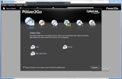 Mit Power2Go 7 kann der Anwender Daten, Fotos, Musik und Videos auf DVD, CD und Blu-Ray brennen. Dabei unterstüzt das Brennprogramm auch das BDXL-Format, wodurch das Brennen von bis zu 128 GB auf eine einzige Disk möglich wird. Die Bedienung von Power2Go ist aufgabenorientiert, wie der folgende Screenshot zeigt.