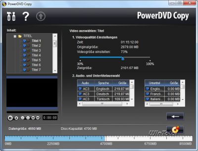 PowerDVD Copy dagegen transkodiert DVD-Filme, sofern diese nicht CSS-verschlüsselt sind. Da dies die wenigsten Kauf- und Verleihfilme sind, hält sich der Nutzen ohne – in Deutschland illegale – Zusatzprogramme sehr in Grenzen. Im Idealfall kann der Anwender bestimmen, welche Bestandteile (Hauptfilm, Trailer, Menü, Tonspuren etc.) den Weg auf das Zielmedium finden und wie gut die Gesamtqualiät in Bezug auf das Original wird.