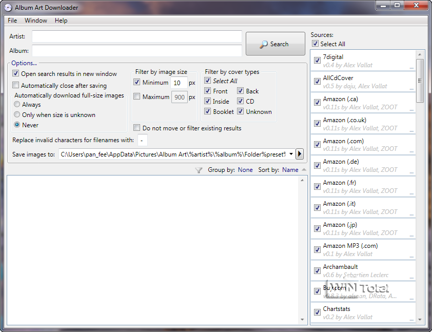 Album Art Download XUI (Nachfolger von Album Art Downloader) sucht auf über 50 Seiten im Netz (Amazon, Google Bildersuche, LastFM, AllCDCover etc.) nach Musik-Covern und zeigt die Ergebnisse in einer Vorschau an. Für die Suche kann neben dem Interpreten und Albumtitel auch begrenzt werden, welche Größe in Pixel die Cover mindestens bzw. maximal haben dürfen.