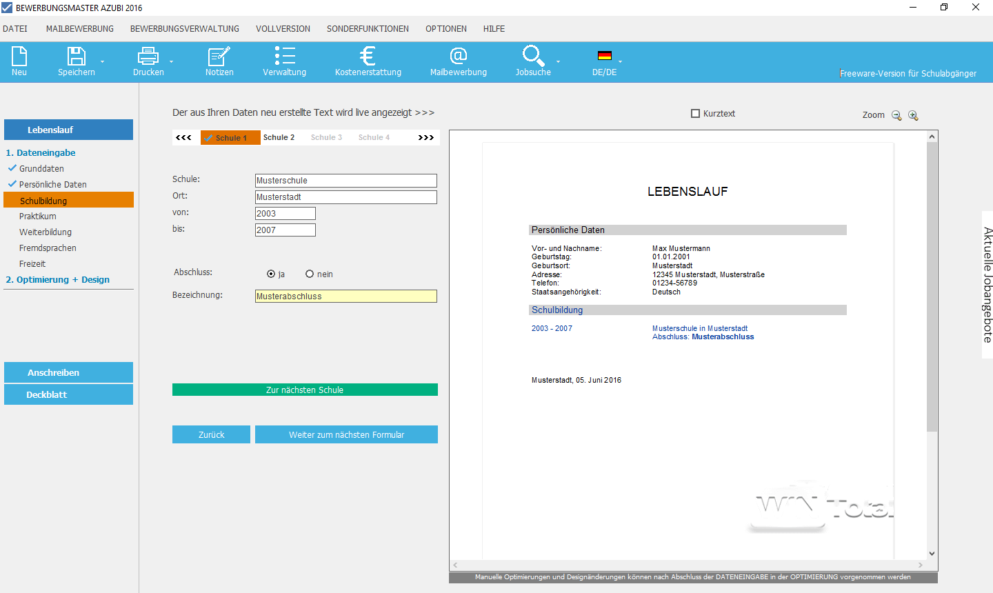 BewerbungsMaster hilft beim Erstellen von Bewerbungen und bietet zahlreiche Möglichkeiten, um diese auch optisch individuell anzupassen. Es können neben Deckblatt und Bewerbungsschreiben auch Lebenslauf sowie ein persönliches Profil / „Dritte Seite“ angefertigt werden.