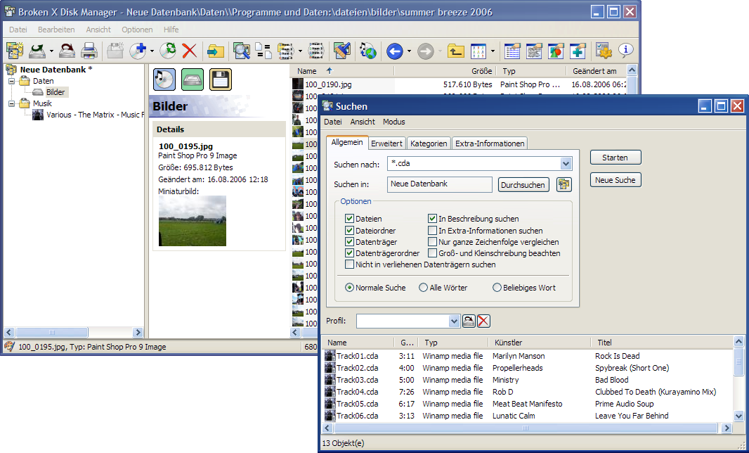 Broken Cross Disk Manager ist ein Programm zur Verwaltung und Archivierung von Datenträgern aller Art (CDs, DVDs, Festplatten, Zips, USB-Sticks, Netzwerkfreigaben, etc.) unter Microsoft Windows. Der Inhalt der katalogisierten Datenträger wird in kompakten Datenbankdateien gespeichert, die auch auf einer Netzwerkfreigabe liegen können.