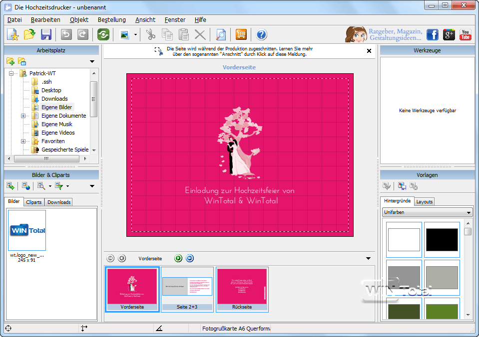 Die Hochzeitsdrucker ist eine kostenfrei nutzbare Software, mit der Hochzeitszeitungen, Hochzeitsbücher und Ähnliches erstellt werden können. Kosten fallen nur dann an, wenn die selbst erstellten Dokumente gedruckt werden sollen.