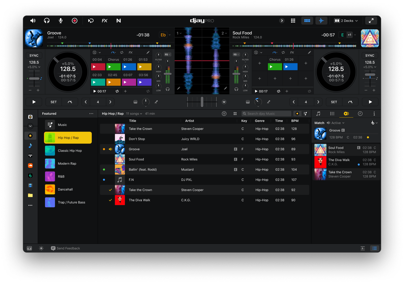 Für professionelle Anwender bietet Djay Pro MIDI-Support für passende MIDI-Controller, Ausgabe über mehrere Audio-Interfaces und Vorhören von Songs im Kopfhörer, während ein anderer Song gerade abgespielt wird.