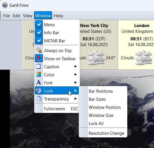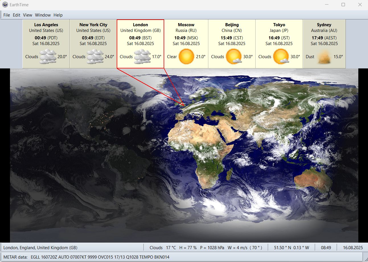 EarthTime ist ein Tool, um Zeiten und die Wetterlage beliebiger Orte auf dem Desktop anzuzeigen.