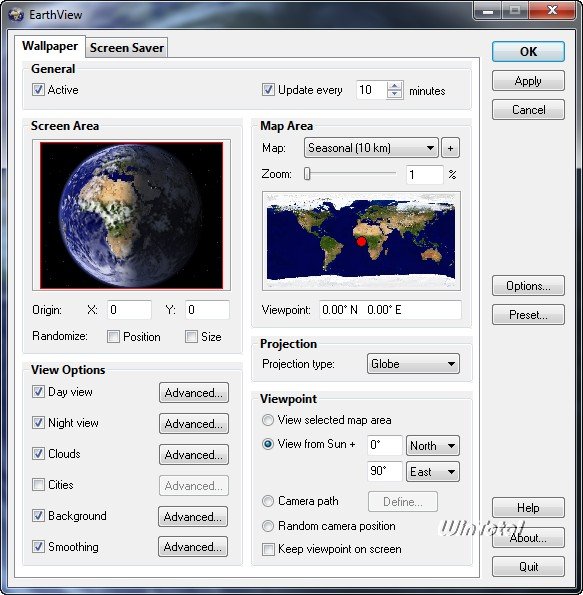 EarthView ist ein dynamisches Desktop-Wallpaper sowie ein Bildschirmschoner, mit dem ein Blick auf die Erde mit Tageslicht und Nachtschatten möglich ist.
