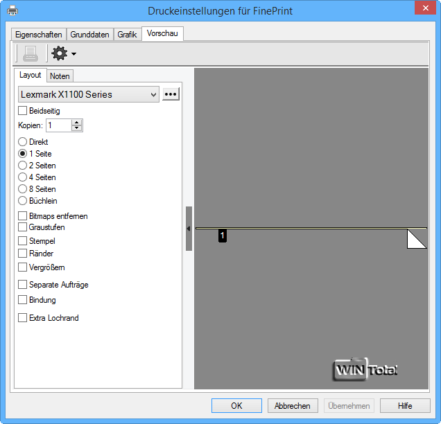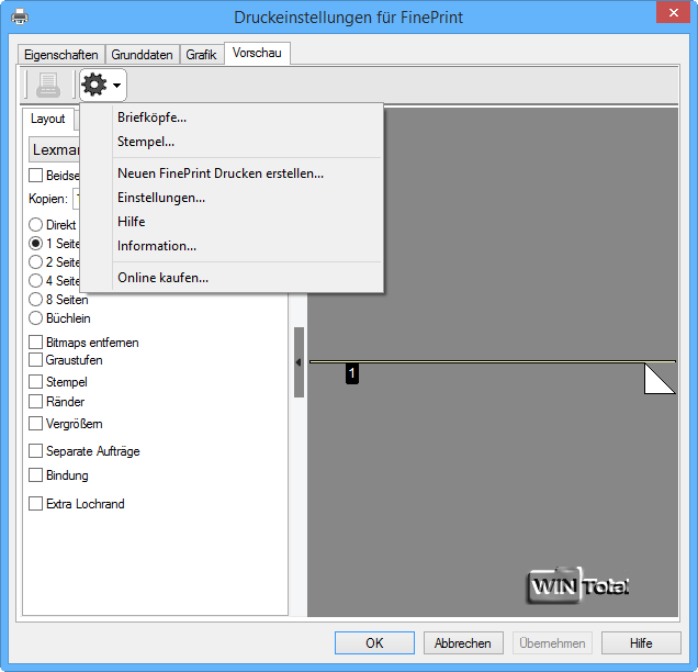 Nach der Installation bindet sich FinePrint als weiteren Drucker ein. Sie können alle Druckaufträge an FinePrint übergeben und haben dann folgende Möglichkeiten vor dem eigentlichen Druck: