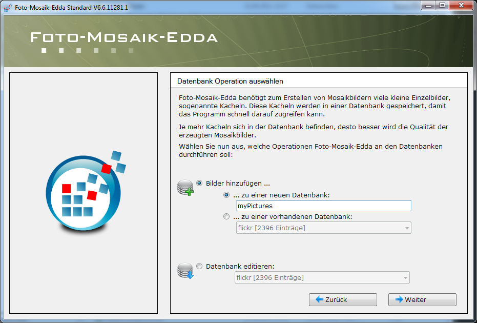 Nach dem Start der Software müssen zunächst die Ordner für die Bilder ausgewählt werden, aus denen später die Mosaikkacheln erstellt werden. Die Bilder werden auf ihre Helligkeit analysiert und in einer Datenbank gespeichert.