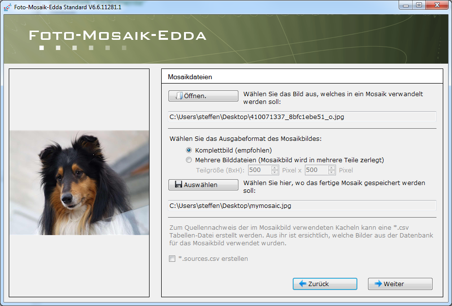 Im dritten Schritt geben Sie das Quellbild an, das Sie später als Mosaik darstellen möchten, sowie den Namen und den Ordner für das fertige Bild.