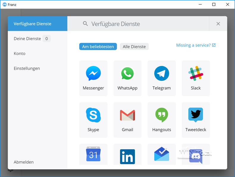 Franz unterstützt in einer Anwendung viele Chat-Dienste, darunter WhatsApp, Facebook, Slack, HipChat, Telegram und viele mehr. Eine komplette Liste der ständig wachsenden Anzahl an unterstützten Services ist auf der Herstellerseite zu finden.