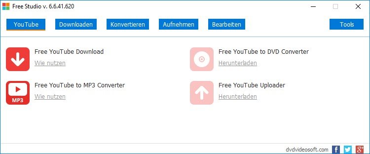 Free Studio ist eine Sammlung von Multimedia-Tools, um Videos von YouTube herunterzuladen oder Musik von YouTube in MP3 zu konvertieren, Downloader für andere Plattformen wie Instagram oder Torrent-Netze, Konverter für Audio- und Videoformate aller Art, Screenrecorder und Hilfsprogramme wie Audiodeditor oder Videoaufnahmen drehen.