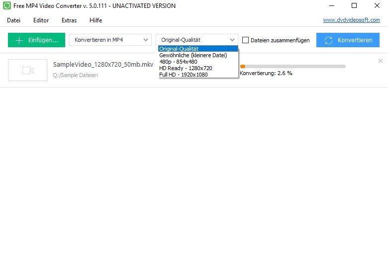 Für Formatkonvertierungen bietet Free Studio gleich mehrere Werkzeuge. Der Free MP4 Video Converter konvertiert vorhandenes Videomaterial (möglich sind beispielsweise avi, mpg, mkv, div, divx, ts, vob, mov und viele weitere Formate) in das MP4-Format zu überführen, wobei Sie die Qualität noch anpassen können. Die kostenlose Fassung legt aber ein Wasserzeichen in die konvertierte Datei ein.