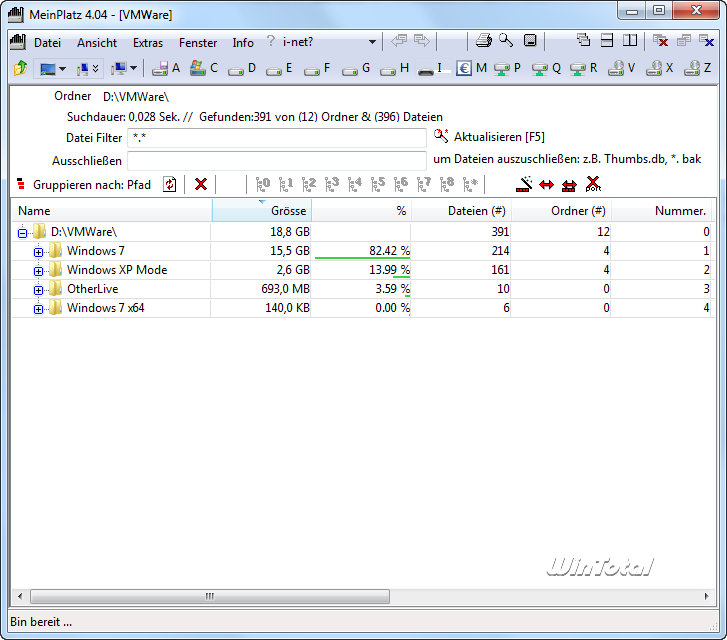 MeinPlatz zeigt den belegten Platz von Ordnern und Dateien auf den Festplatten an. Sie bekommen die Ergebnisse in übersichtlichen Listen mit vielen Spalten angezeigt und können so die Ausgabe nach verschiedenen Kriterien sortieren (z.B. Dateierweiterung, Änderungszeit, Größe oder Ordner).
