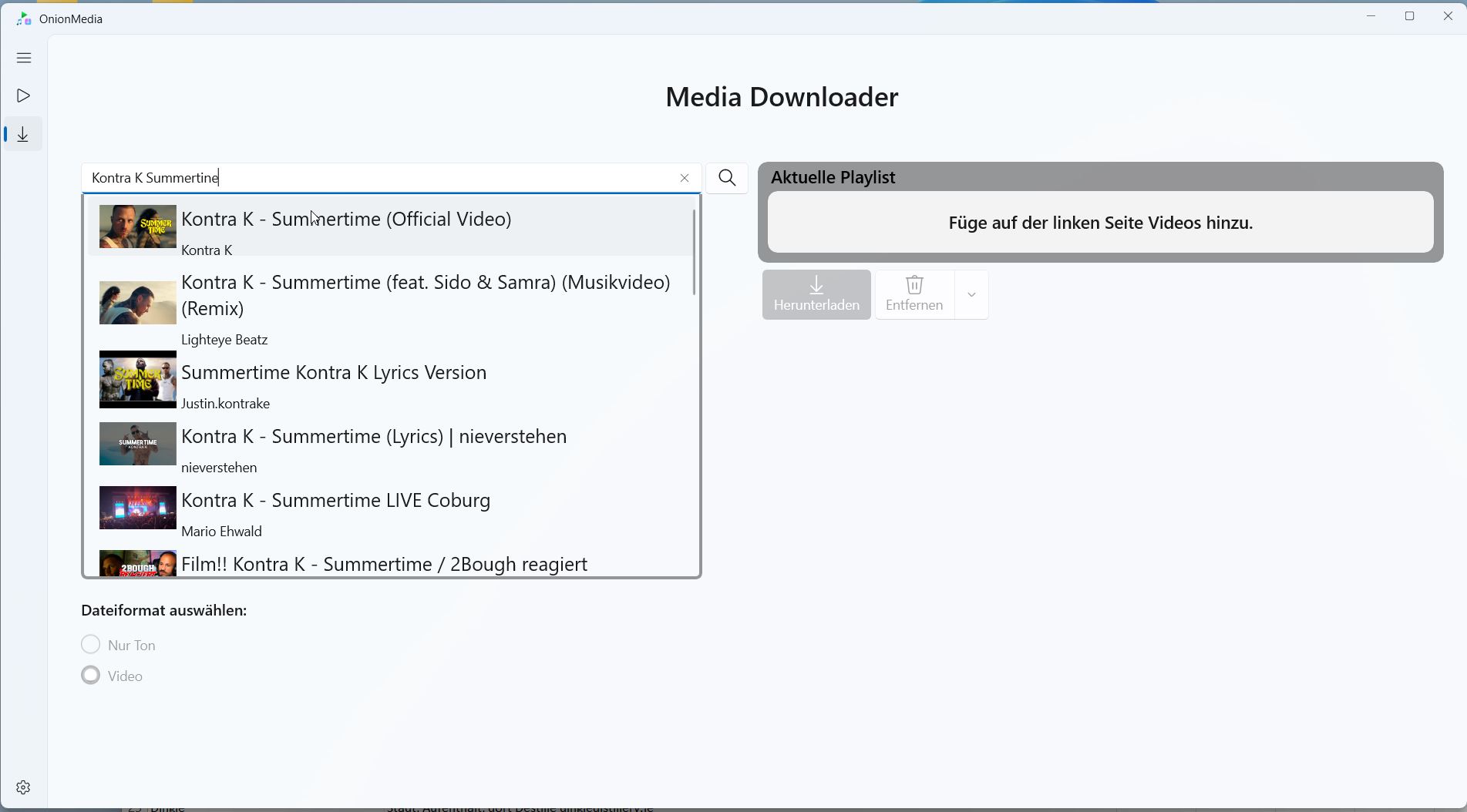 Sie können die Videos über das Suchfenster finden, indem Sie dort Künstler, Themen oder Songs eingeben. Die Suche greift auf YouTube zu und zeigt die gefundenen Inhalte in einer Vorschau an. Sie können aber auch von fast allen bekannten Videoplattformen, auch von sozialen Netzwerken wie Facebook oder TikTok oder Instagram, eine URL in das Suchfenster kopieren und so diese Videos lokal als Datei speichern.