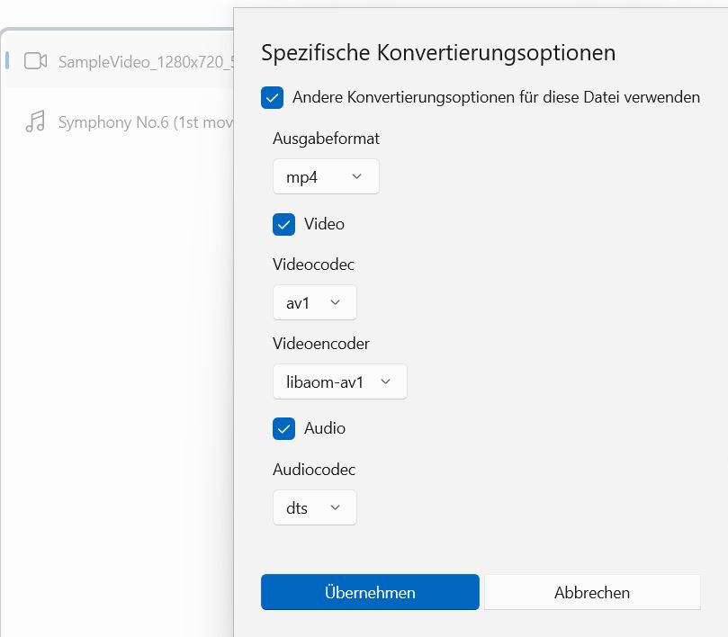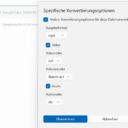 Als Ausgabeformate für Video stehen zunächst MP4 mit H.264 sowie H.265 und für Musik M4A, MP3, OGG und Wave Audio zur Verfügung. Hinter dem Zahnradsymbol lassen sich aber auch spezifische Konvertierungsoptionen sowohl für das Ausgabeformat als auch für den verwendeten Audio- und Videoencoder festlegen.