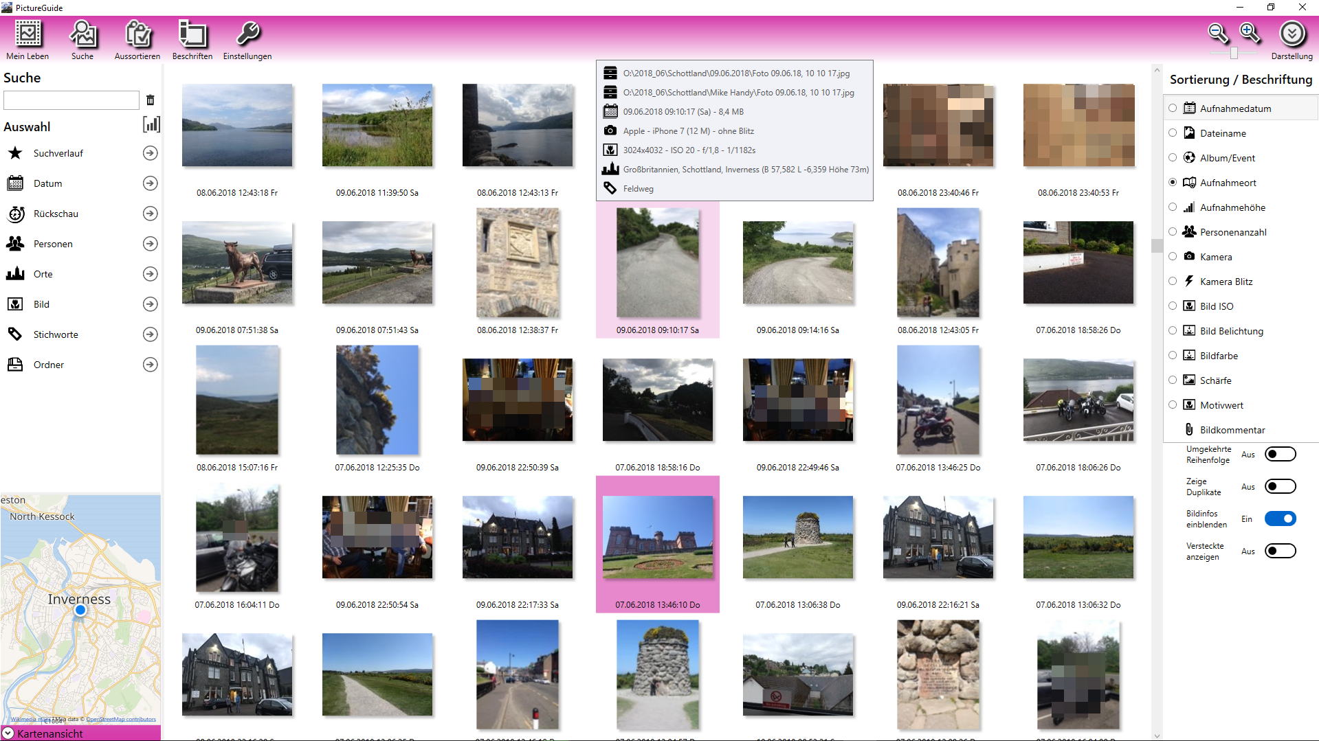 - Auswertung von GPS-Daten in Fotos mit Filter für Länder, Orte sowie Kartendarstellung