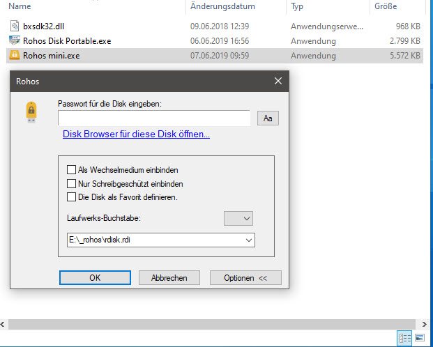 Für die mobile Nutzung anderen Windows-Systemen findet sich auf dem Stick auch Rohos Mini Drive Portable. Mit diesem Disk Browser können Sie auch auf die verschlüsselte Partition zugreifen, ohne weitere Software installieren zu müssen.