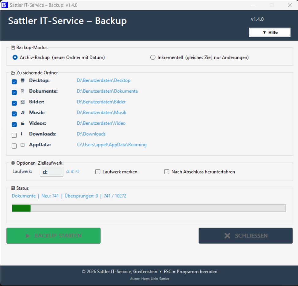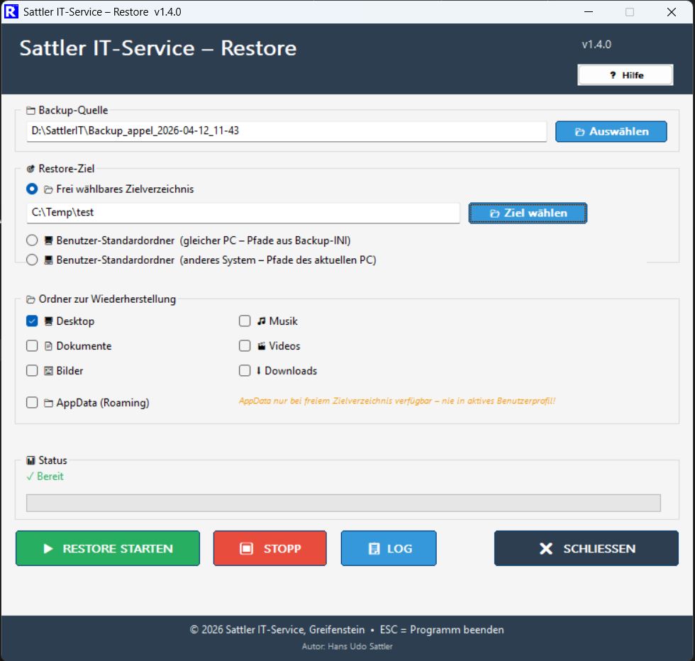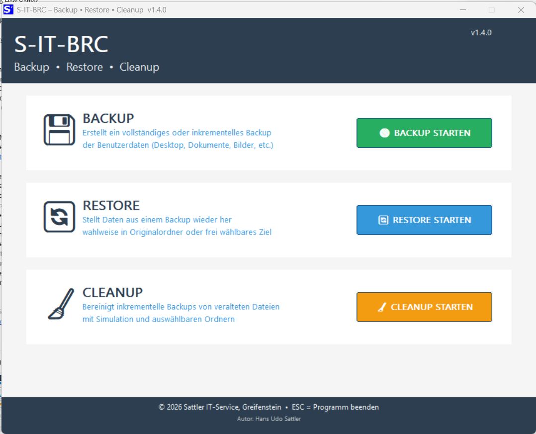 S-IT-BRC steht für Backup, Restore und Cleanup. Mit dem kostenlosen Tool können wesentliche Benutzerdaten wie Desktop, Dokumente, Bilder, Musik, Videos, Downloads usw. vollständig oder inkrementell im Originalformat auf ein externes Laufwerk gesichert und wiederhergestellt werden. Das Tool eignet sich damit für die regelmäßige Sicherung sowie den Umzug von einem PC auf ein anderes System.