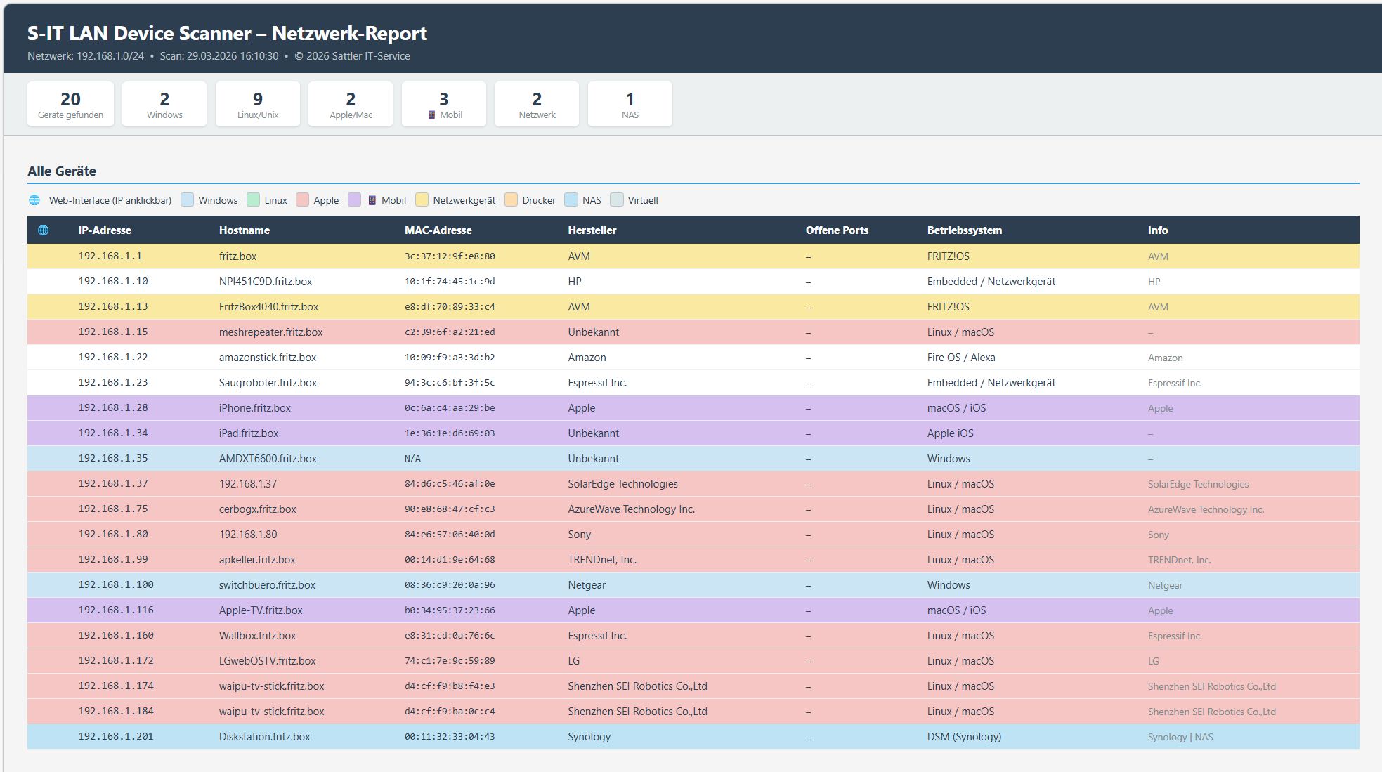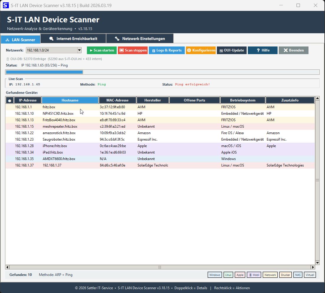 Der S-IT LAN Device Scanner ist ein professionelles Diagnosewerkzeug für Windows-Netzwerke. Das kostenlose, portable Tool scannt Netzwerke nach auffindbaren Geräten und zeigt diese in einem übersichtlichen Report mit Host-Namen, MAC-Adresse, Hersteller, Betriebssystem, offenen Ports und Geräteklasse an.