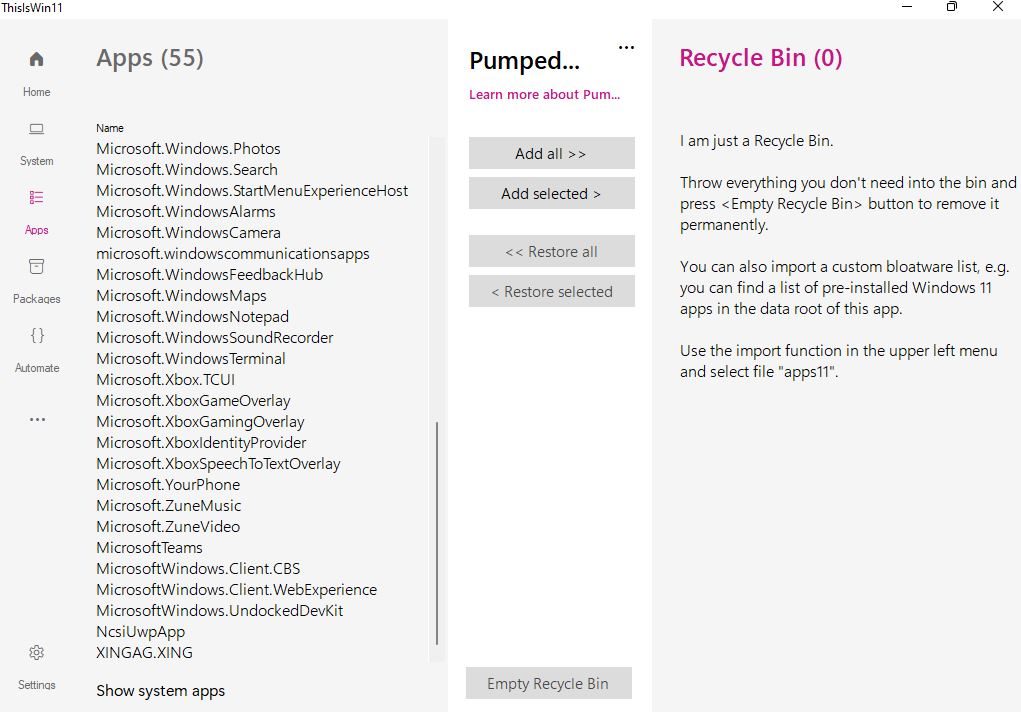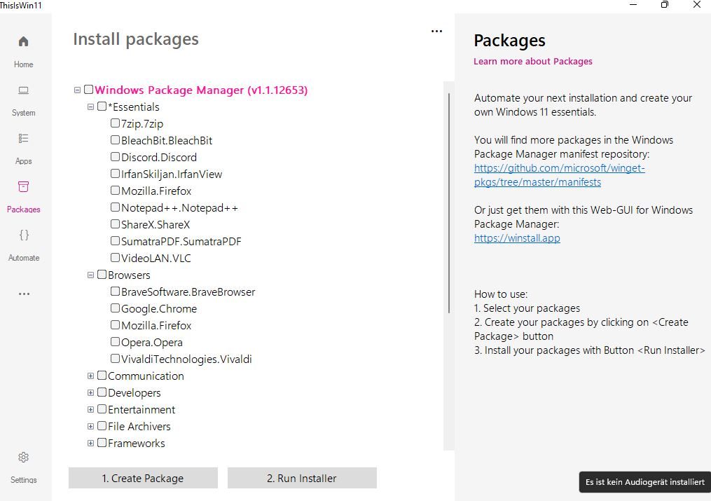 Im Abschnitt Apps sehen Sie alle installierten und in einigen Fällen auch unterwünschten Apps, die Sie mit einem Klick wieder entfernen können. Im Abschnitt Packages dagegen können Sie häufig benötigte, kostenlose Programme wie 7-Zip, VLC, GIMP usw. mit nur einem Klick herunterladen und in das System integrieren.