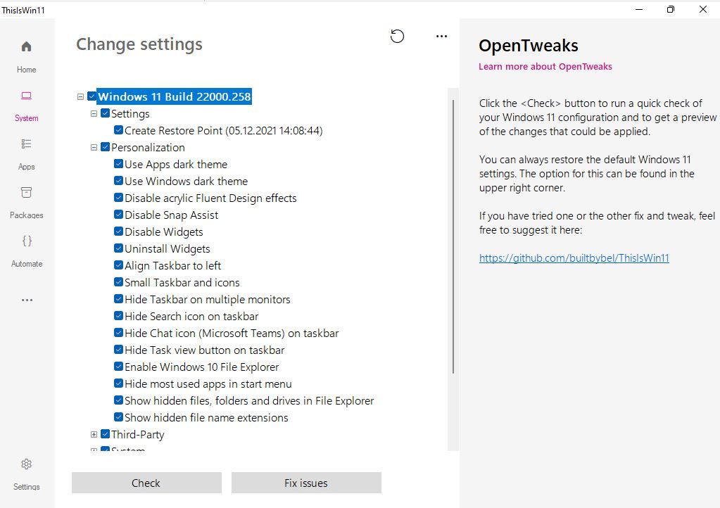 Ein weiterer Bestandteil von ThisIsWin11 ist die Möglichkeit, Windows 11 in Grenzen den eigenen Wünschen anzupassen. Dazu bietet die portable Freeware viele Einstellmöglichkeiten, um bestimmte Optik-Elemente an- oder abzuschalten, den Explorer von Windows 10 wieder zu aktivieren und vieles mehr. Aus dem Tool heraus können Sie auch jederzeit einen Wiederherstellungspunkt erstellen, um etwaige Änderungen wieder rückgängig zu machen.