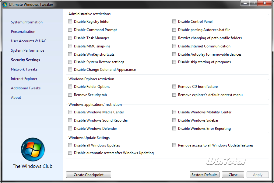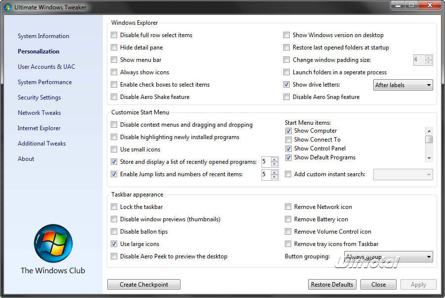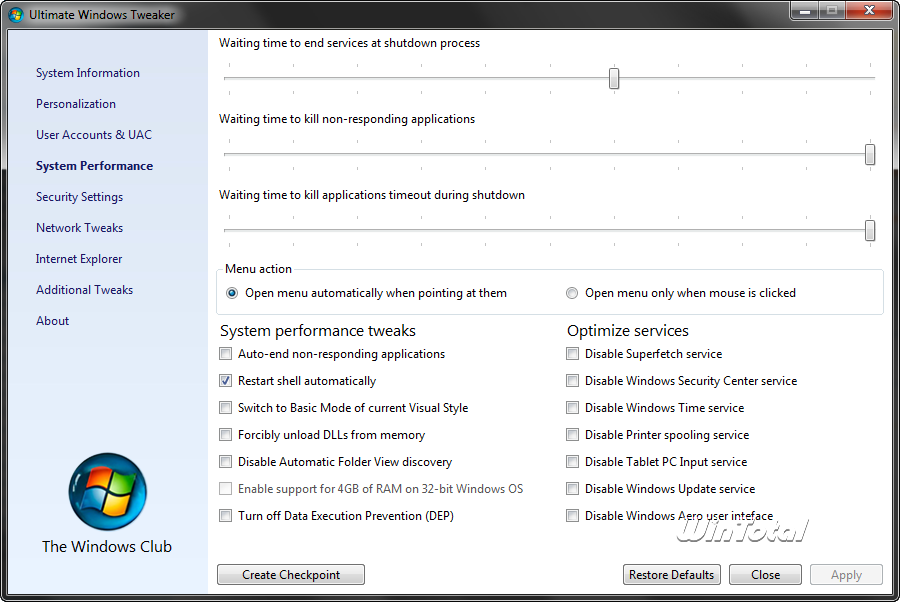 Ultimate Windows Tweaker (UWT) vom The Windows Club ist eine Tuning-/Tweak-Suite im Stile von Tweak UI aus den PowerToys, welche leider nicht unter Windows Vista und Windows 7 laufen.