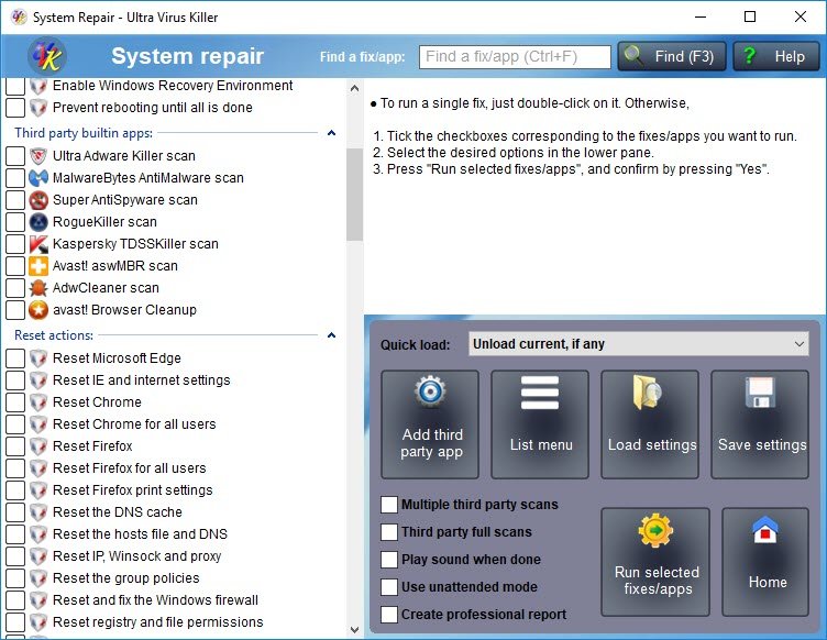System Repair dagegen bietet eine Vielzahl von Scripts, welche viele Probleme, eventuell durch Virenbefall oder andere Defekte am System verursacht, beheben oder umgehen. Hierbei wird UVK auch von dem Ultra Adware Killer unterstützt, welcher das System nach unerwünschten Programmen wie Adware, Toolbars oder Browsererweiterungen durchsucht und diese löschen kann.