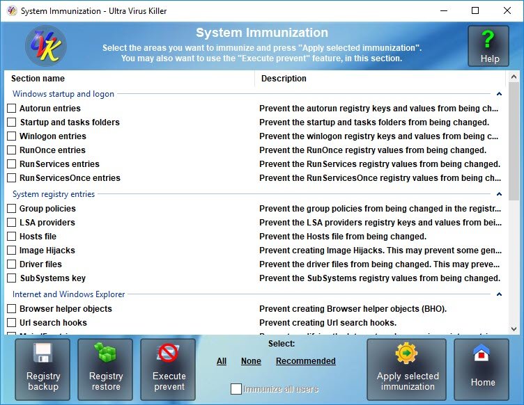 Mit der System Immunization nimmt der Ultra Virus Killer einige Veränderungen an Windows vor, um das System vor Angriffen besser abzusichern, indem beispielsweise keine Änderungen mehr an den Autostart-Einträgen oder wichtigen Registry-Schlüsseln erlaubt werden, die Host-Datei geschützt wird oder die Einstellungen der Browser geschützt werden.