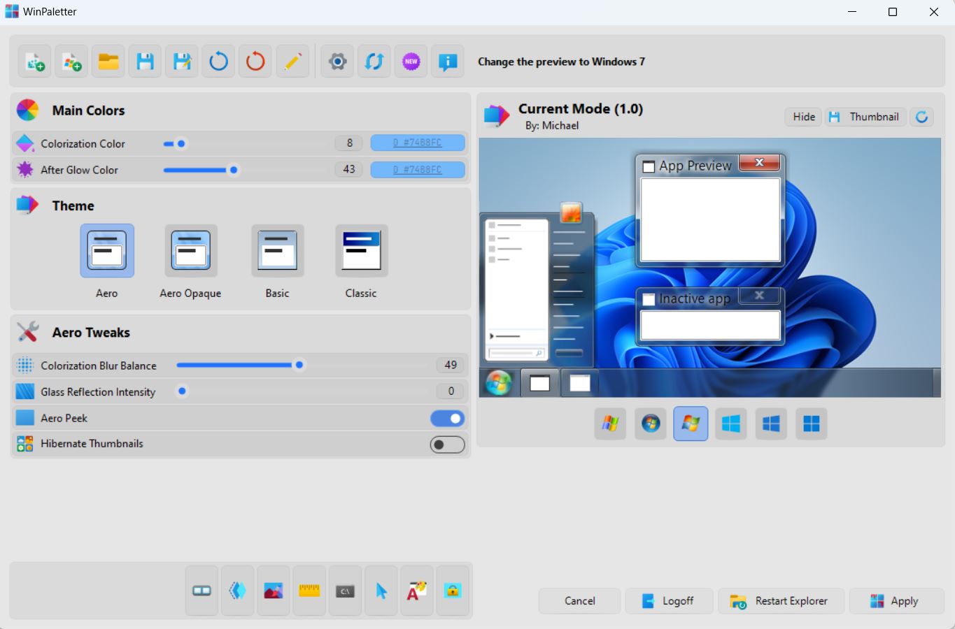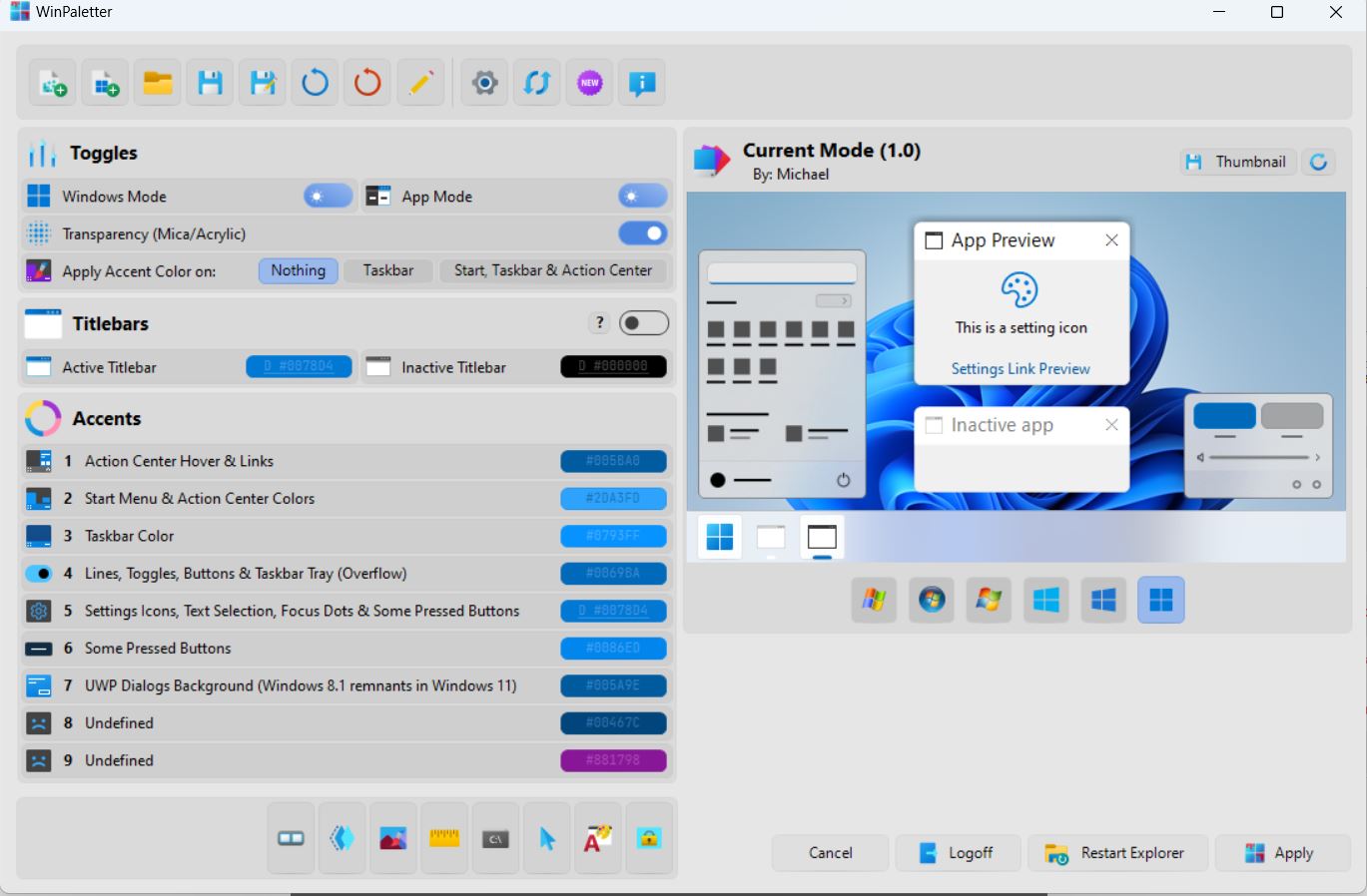 WinPaletter ist ein mächtiges Werkzeug, um das Aussehen von Windows den eigenen Wünschen anzupassen. Sie können über zahlreiche Menüs Farben von Elementen, Fonts und Schriftgrößen, Icons, Desktophintergrund, Animationen und Effekte sowie das gesamte Erscheinungsbild im Stile von Windows XP bis Windows 11, inklusive einem Startmenü, anpassen und verändern.
