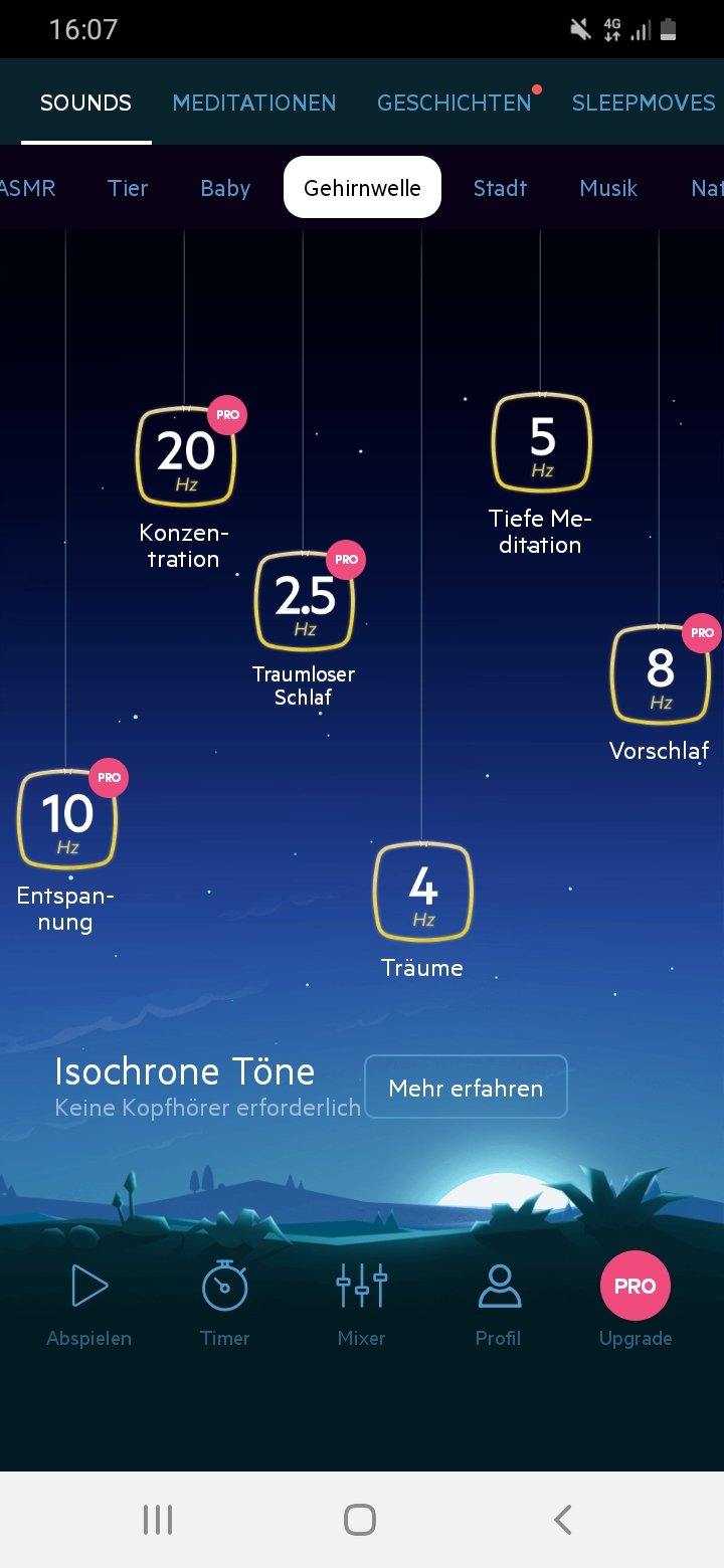 Auf der Startseite von Relax Melodies finden Sie diverse Töne, die an kleinen Kärtchen vor einem Nachthimmel angebracht sin. Das An- und Ausschalten funktioniert mittels Fingertipp auf das jeweilige Geräusch-Kärtchen. Wischen Sie nach links, um zu den isochronen und binauralen Tönen zu gelangen (letztere erfordern allerdings Kopfhörer).