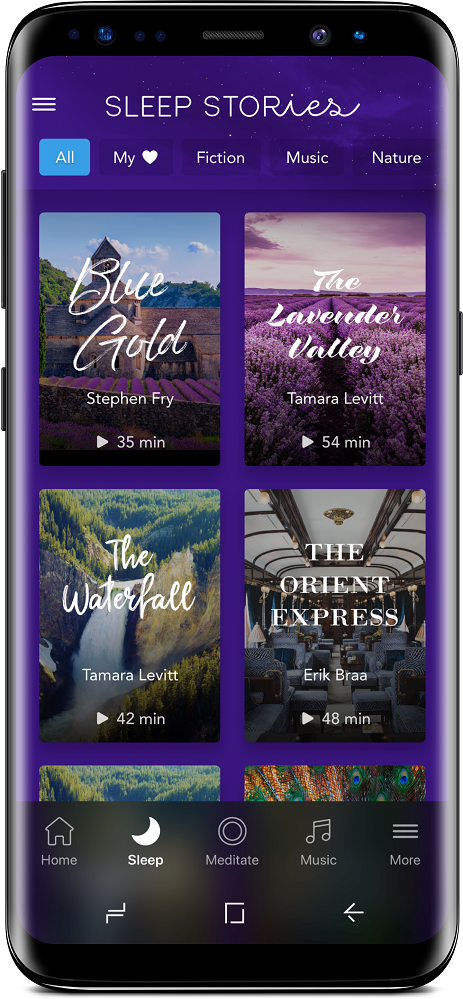 Auf der Startseite finden Sie neben dem „Home“-Button auch die Punkte „Schlaf“, „Meditation“, „Musik“ und „Mehr“. Hinter letzterem verbirgt sich das Menü, über das Sie unter anderem festlegen können, ob Sie auch auf englischsprachige Inhalte zugreifen möchten. Die Kategorien sind thematisch sortiert. So stehen beispielsweise unter „Schlaf“ neben verschiedenen Musik-Stücken auch Erzählungen, Kinder- und Naturgeschichten bereit.