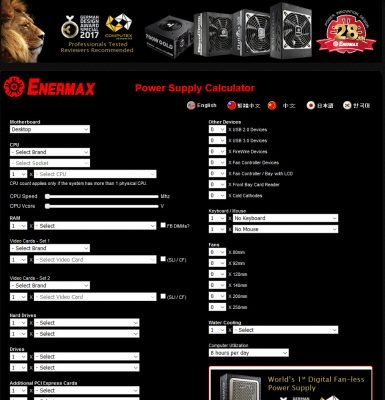 Im Handel gibt es Gehäuse, welche bereits über ein Netzteil verfügen. Sie sollten hierbei aber beachten, welche Leistung das Netzteil benötigt, um ohne Überlastung ausreichend Strom für CPU, RAM und Spiele-Grafikkarte zur Verfügung zu stellen. Enermax, einer der führenden Hersteller von PC-Netzteilen, bietet auf seiner Webseite einen Power Supply Calculator. Sie geben hier die verbauten Komponenten ein und bekommen eine Empfehlung, welche Wattzahl das Netzteil unterstützen sollte.