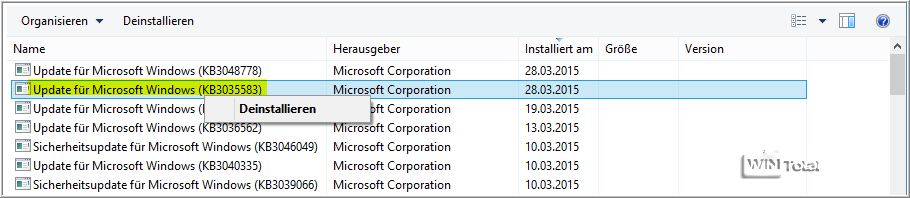 Klicken Sie dazu im Windows-Update-Fenster ganz unten links auf „Installierte Updates“. Ändern Sie die Ansicht auf „Details“ und klicken Sie auf „Installiert am“, so dass das aktuelle Datum oben steht. So sollten Sie den Eintrag „Update für Microsoft Windows (KB3035583)“ schneller finden. Mit Rechtsklick auf den Eintrag können Sie das Update deinstallieren.