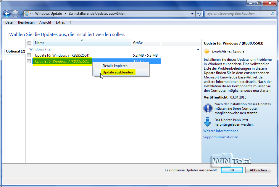 Beim nächsten Update wird KB3035583 unter „Optional“ angezeigt, hier können Sie das Update mit einem Rechtsklick ausblenden.