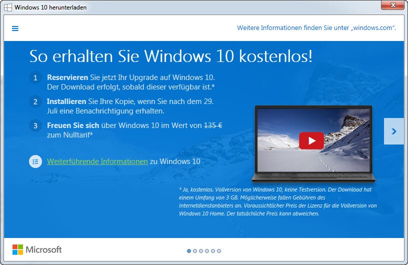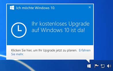 Klickt man auf das Icon, bietet Microsoft eine kostenlose Registrierung für das Upgrade auf Windows 10 an.