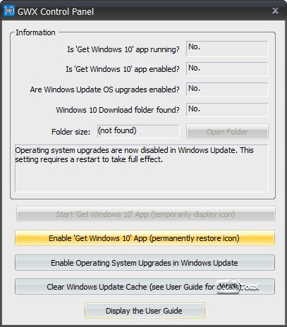 Fühlt sich der Anwender für Windows 10 bereit, kann man mit dem Tool die Einstellungen einfach wieder zurücksetzen (Enable ‚Get Windows 10‘ App)