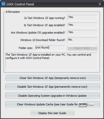 Der Anwender kann nun GWX temporär oder auch permanent deaktivieren, Systemupgrades über Windows Update verhindern oder den Windows Update Cache leeren.